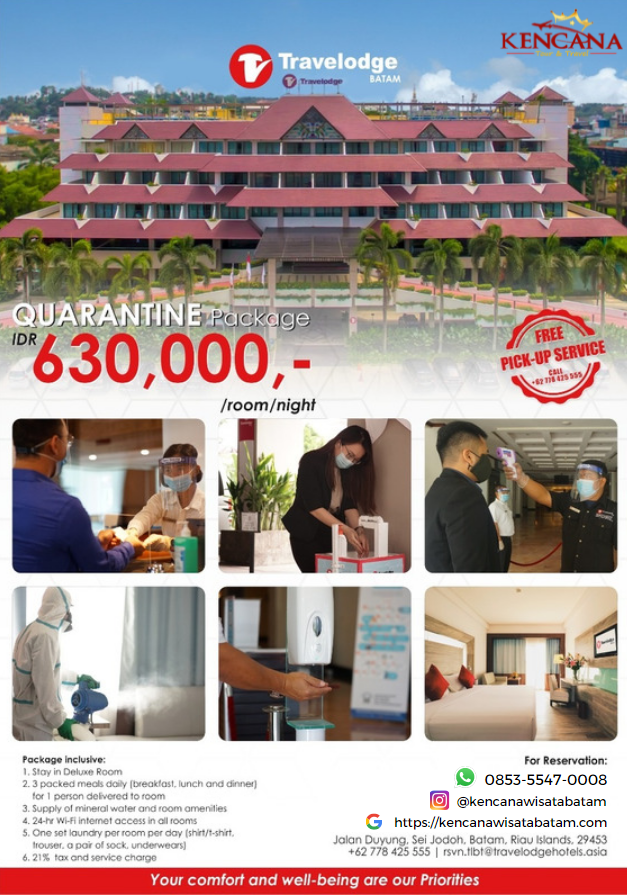 Quarantine Package : Travelodge Tap Here for FAST BOOKING Contact Person :Telp/Wa : +62 853-5547-0008 (Kantor)WhatsApp : +62 812-7765-880 (Donna) Instagram : @kencanawisatabatam